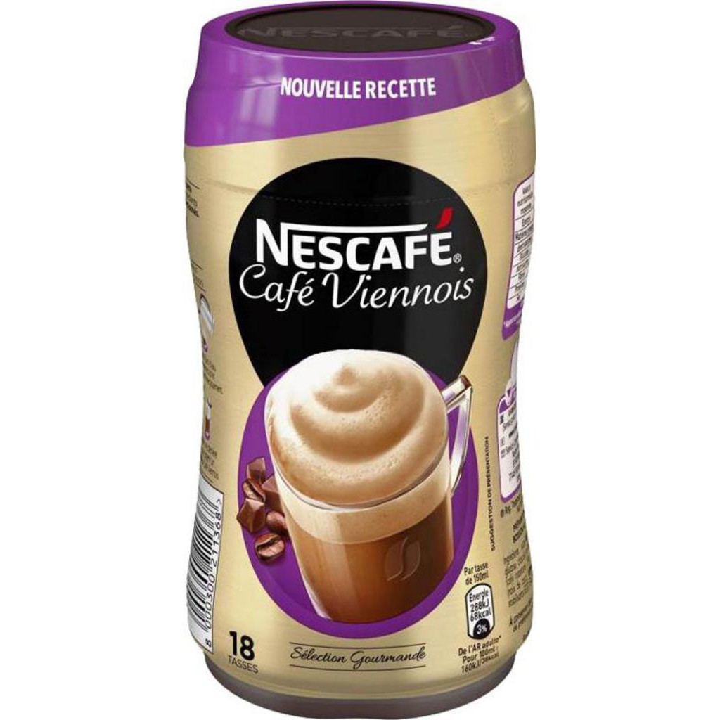 Grâce au savoir-faire de Nescafé, profitez d’un moment de pure gourmandise en savourant un délicieux Café Viennois. Nos experts ont créé une nouvelle recette gourmande aux ingrédients soigneusement sélectionnés: des cafés de qualité alliant la finesse de l’arabica et la richesse du robusta, une touche de chocolat et une mousse irrésistiblement onctueuse et généreuse. Sucre, lait écrémé en poudre 18%, sirop de glucose, chocolat en poudre 9% (sucre, cacao), café 8,5% (café instantané 7,9%, café torréfié moulu), huile végétale (noix de coco), lactose, correcteur d'acidité (E340), sel, stabilisants (E331, E452), arôme naturel.